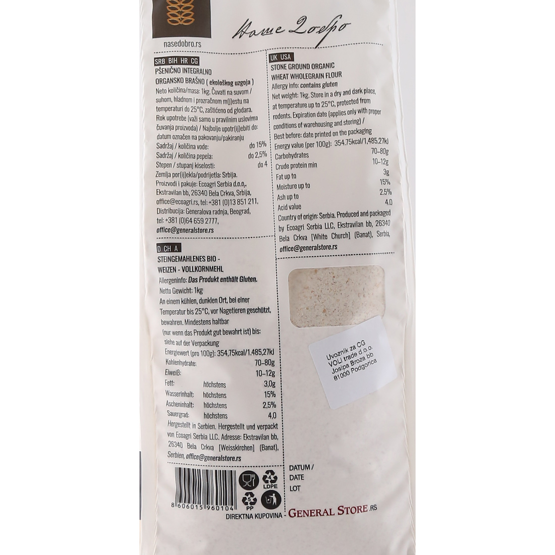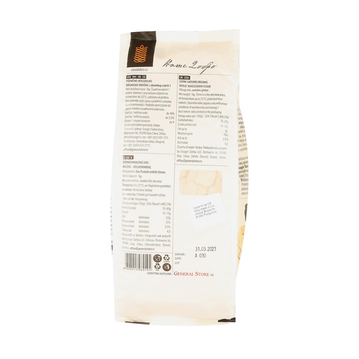 Stone ground organic wheat whole grain flour 1 kg Nase Dobro
